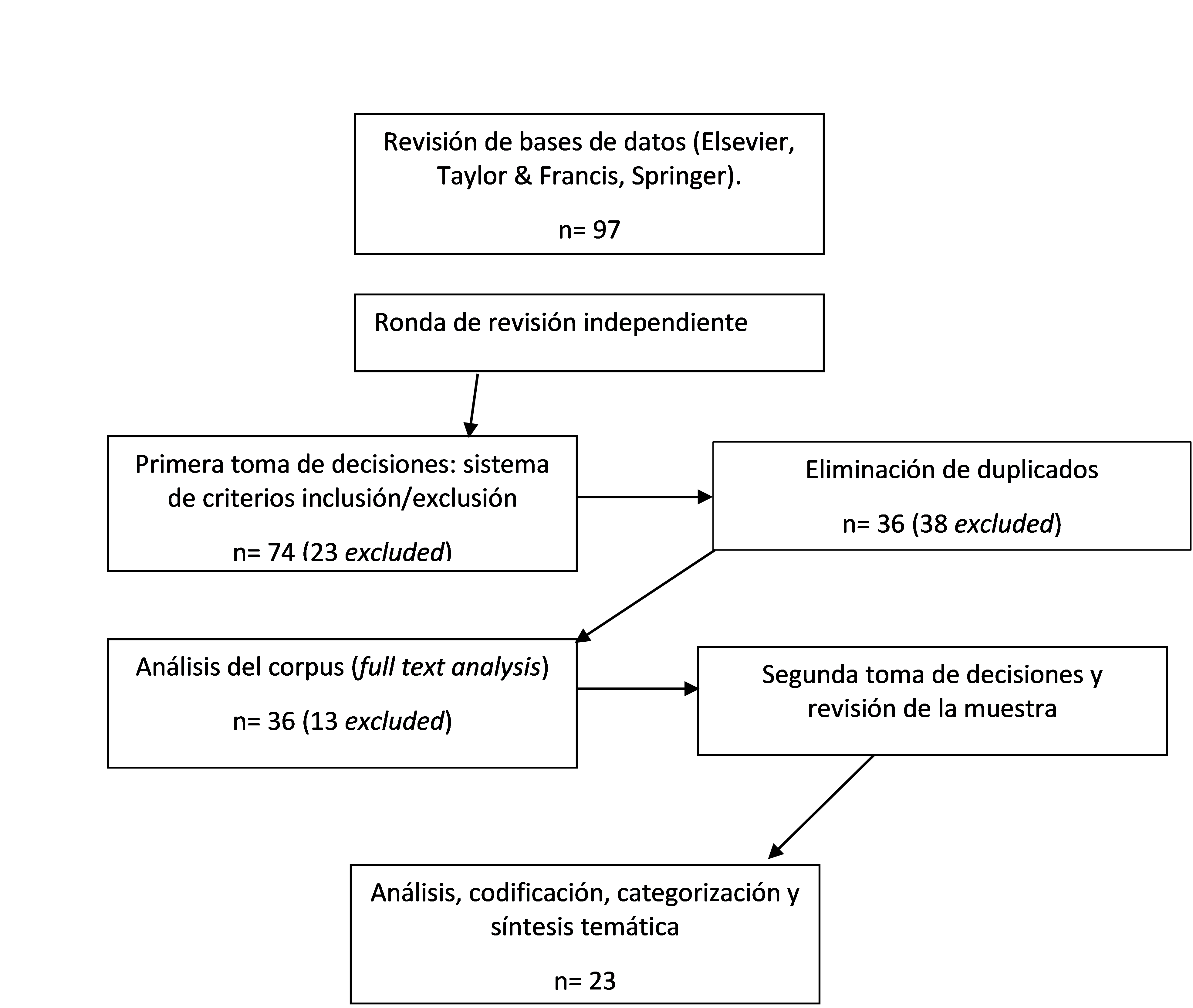 Los criterios de inclusión-exclusión se centraron en: estudios empíricos con una metodología declarada y evaluable (1), que estudien la relación entre toma de decisiones y gestión del conocimiento (2), que fueron publicado en los últimos cuatro años (3), en idioma inglés (4), que permitiesen la construcción de un análisis temático (5). Tras la aplicación de los criterios elaborados se eliminaron los textos duplicados (n=38) y los que no cumplieron con los requisitos de rigor e integridad metodológica (n=23). Los 36 textos restantes fueron analizados en conjunto (full-text) y se eliminaron 13 textos, de manera que la muestra final quedó conformada por 23 artículos en atención a su contribución al campo de estudio.