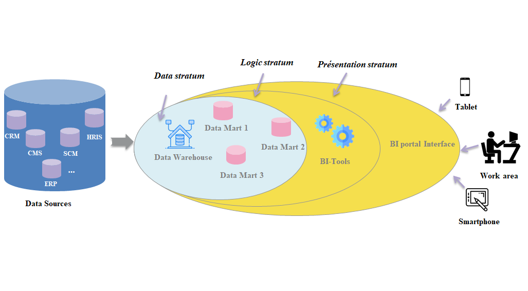Once the Business Intelligence (BI) user transfers their data to the cloud, the BI (Logical Layer) tools activate to exploit the cloud environment, thus analyzing the data received and stored in the data warehouse. This approach allows a subsequent re-analysis of the data, which becomes easily accessible via the presentation layer (figure 2). The information is then presented in the form of reports and graphs via a BI portal interface. This interface offers end users a way to access data from various devices such as mobile phones. Modern BI portal interfaces are typically designed to be responsive and adaptable to different types of devices, ensuring users have a consistent experience across devices.