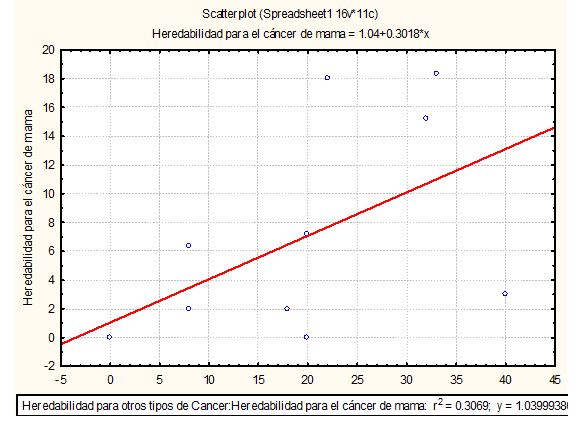 Resultados: existió una agrupación preferencial de esta enfermedad en las familias que, en la población, los factores genéticos definieron la prevalencia familiar del cáncer de mama en los parientes de los casos y existió una tendencia creciente de padecer la enfermedad en la medida que aumenta la proporción de genes a compartir.