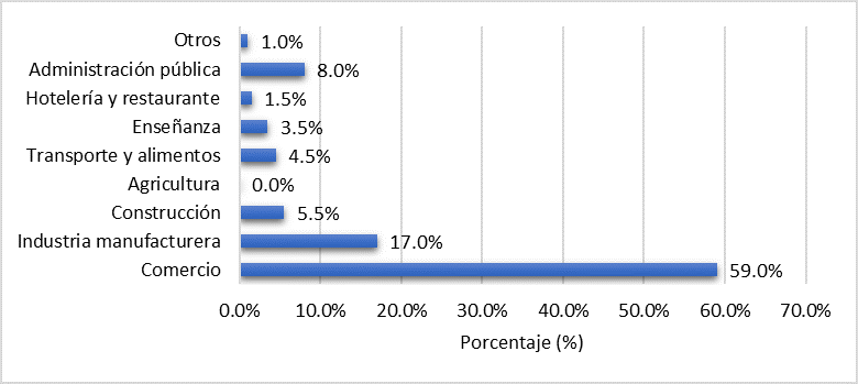 En la tabla 1 y figura 1 se muestran los resultados correspondientes a las actividades económicas realizadas por los trabajadores encuestados en la ciudad de Juliaca, donde se evidencia que el 59 % desempeña actividades relacionadas con el comercio. Asimismo, otras actividades de importancia que sobresalen son la industria manufacturera (17 %), la administración pública (8 %), la construcción (5,5 %), transporte y alimentos (4,5 %) y enseñanza (3,5 %).