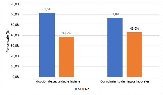 Aunado a ello, antes de incorporarse a su puesto de trabajo los nuevos trabajadores deben recibir una orientación por parte de sus empleadores, en este caso se cumple en un 61,5 % recibe inducción de seguridad e higiene. Durante este tiempo, deben aprender la siguiente información: normativa y políticas en cuestiones de seguridad en el trabajo aplicadas internamente, el uso que hace la empresa de la señalización, conocer el lugar de trabajo, comprensión de los riesgos que entraña el trabajo que hay que realizar, importancia del conocimiento de enfermedades y lesiones derivadas del trabajo y procedimientos de emergencia de la empresa. Además, se observó un nivel de conocimiento de riesgos laborales del 57 % en los trabajadores encuestados, lo que sugiere que, para aumentar el conocimiento público del tema, es crucial la participación de los trabajadores en el control de los peligros laborales.