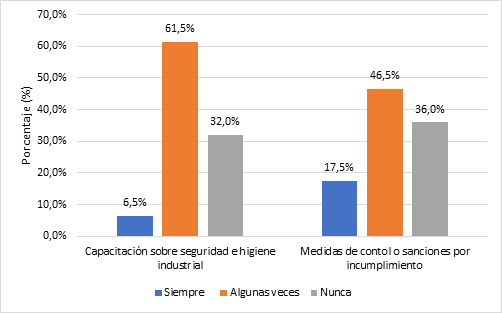 Asimismo, se evidenció que existe un porcentaje de trabajadores que no recibe capacitación (32 %) sobre seguridad e higiene industrial, mientras que el 61,5 % indica que algunas veces y solo el 6,5 % si recibe capacitación. Por su parte, en cuanto a las medidas de control o sanciones aplicadas por la empresa por incumplimiento, un 17,5 % se cumplen, 46,5 % a veces y 36 % nunca, lo que muestra una falta de concientización de los trabajadores. Consecuentemente, el estudio de Flores(5) concuerda con los resultados, señalando que las empresas estudiadas muestran incoherencias a este respecto al darle poca importancia a las capacitaciones sobre seguridad e higiene industrial y a la aplicación de sanciones derivadas del incumplimiento de la normativa. Debido a que su principal objetivo es garantizar la seguridad y el bienestar de todos los trabajadores, tomando las precauciones esenciales para prevenir daños, con el fin de minimizarlos o erradicarlos por completo.
