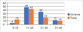 Let us consider the study results for each country separately in more detail than the overall results. Figure 2 shows the results for Ukraine. According to the results obtained, a distinctive feature is the significantly low number of employees who received ratings from 0 to 10 points (29 % of the total result). In other positions, the indicators for the country are higher than for the entire study. The most significant positive gap was observed in the group that received 21 to 30 points (84 %). The results indicate the presence of advanced human resources that, with proper management, can move to the independent production of innovative ideas in terms of risk management, organizing the implementation of these methods, and planning and implementing control over their implementation.