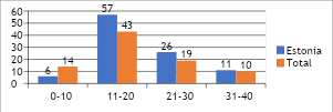 Figure 3 shows the results for Estonia. Just like in Ukraine, it is characterized by a low number of those who received from 0 to 10 points, which is 43 % of the percentage in the study. The remaining categories of specialists are characterized by a positive gap with the research indicators, with the most significant gap observed in the group that received from 11 to 20 points at 16 %. According to the results, Estonia should more actively train managers on how to work with risks and manage them and create conditions for more active expression of their thoughts in the field of risk management, which is a catalyst for the production of innovative solutions.