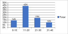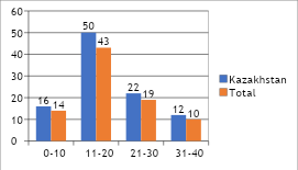 For Kazakhstan, the results of the study are shown in figure 4. There are slight excesses compared to the study results in almost all categories. However, the most alarming is the excess of the number of managers who received from 0 to 10 points compared to the study’s overall results (at 14 %). Taking into account the fact that the most significant excess of results in the country compared to the overall results falls on the group from 11 to 20 points (by 16 %), then in Kazakhstan, it is necessary to pay maximum attention to the training of specialists in the field of international tourism management. Risk management, innovative management methods, and ways to find them must necessarily be included in training programs as their integral part.
