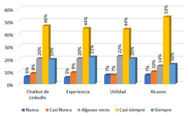 Los resultados muestran que el 46 % de los estudiantes de administración de empresas usan el chatbot de LinkedIn. Asimismo, el 53 % señalan que casi siempre tienen experiencia en el uso del chatbot, siendo de utilidad (44 %), además de obtener el alcance esperado (44 %). Mientras que para la variable crecimiento publicitario, el 43 % indica que ha impulsado su perfil profesional. Además, casi siempre el flujo (37 %) y la funcionalidad (53 %) aportan en la interacción y el contenido de los servicios que ofrece el uso del chatbot para la publicidad. Por su parte, los resultados guardan relación con el estudio de Piguave (2019) quien afirma que el uso de chatbot ayuda en la difusión de información académica, mejorando la infraestructura de las universidades.(46,47,48)