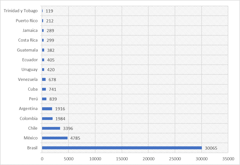 Se realizó un análisis de la producción en investigación en Enfermería en Argentina a través de los indicadores del SCImago Journal & Country Rank (SJR) el cual es un factor de medición que establece indicadores sobre la calidad y el impacto de la producción en investigación (Formación Universitaria, 2012). Al realizarse la búsqueda por país, resulta interesante destacar que, al corte de 1996-2021 a nivel mundial en el área de Enfermería lideran la producción científica: Estados Unidos (330 983 documentos, 19,49 citas/documento), Reino Unido (102 230 documentos, 18,80 citas/documento), Australia (48 116 documentos, 19,78 citas/documento), Canadá (43 052 documentos, 23,38 citas/documento) y Francia (40 424 documentos, 13,73 citas/documento).(41) A nivel de América Latina, la producción científica en enfermería es liderada por Brasil, seguido por México y Chile. Nuestro país, Argentina, ocupa el quinto lugar. Los datos completos se muestran en la Figura 1.