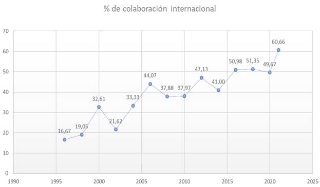 Se puede destacar que la colaboración internacional ha ido aumentando en relación con el tiempo, pasando de 16,67 % en 1996 hasta 60,66 % en 2021.