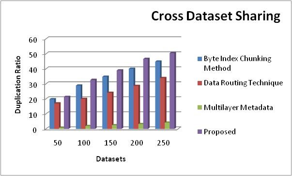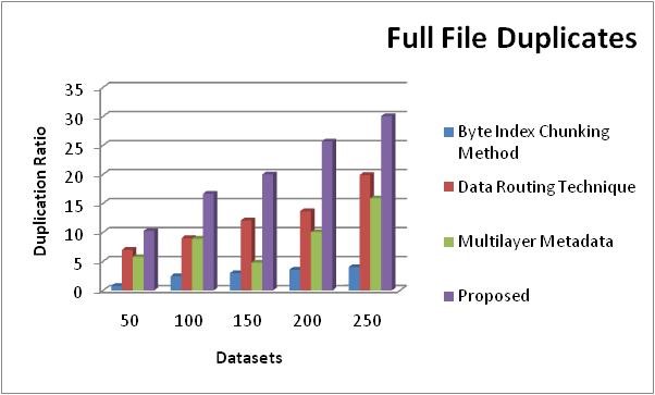Three methods namely, the Multilayer Metadata, Data Routing Technique, Byte Index Chunking technique as well as the proposed technique are compared in the Full File Duplicates Comparison Table 5. The values of the suggested approach are higher than those of the previous method when compared to it. The values of the suggested method range from 10,26 to 30,06.