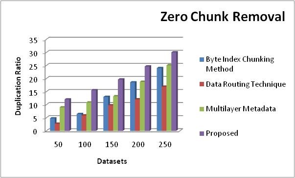 The suggested approach and the 3 currently utilizing methods Multilayer Metadata, Data Routing Technique, Byte Index Chunking approach are compared in the Zero Chunk Removal Comparison table 6. The values of the proposed approach are higher than those of the previous technique when compared to it. The values of the proposed approach range from 12,02 to 30,06