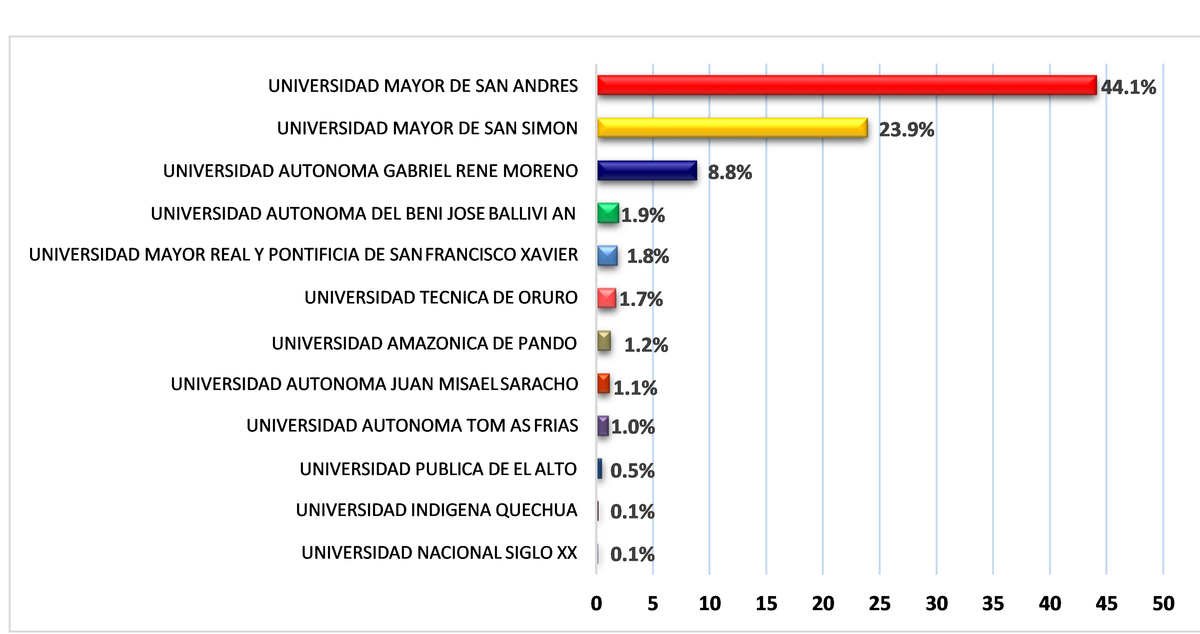 Figure 1. Distribution of documents according to the affiliation of Bolivian public universities.