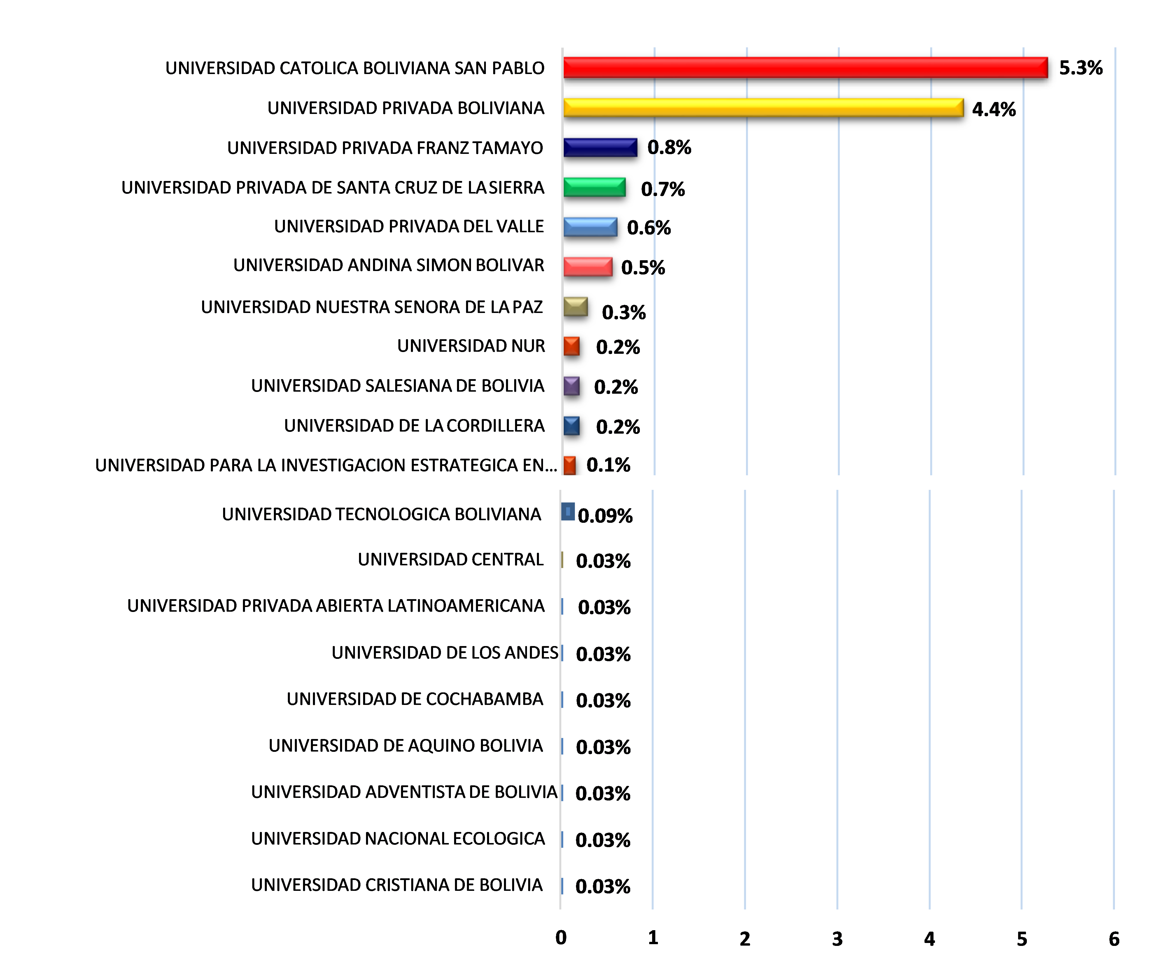 Bolivian private universities are the most numerous in the country, and the distribution of documents can be seen in Figure 2. The private university with the highest scientific production was the Universidad Católica San Pablo with 5,3 %, followed by the Universidad Privada de Bolivia with 4,4 %. Even though private universities represent more than 50 % of registered in the Scopus database, the highest percentage of publications corresponds to public universities.