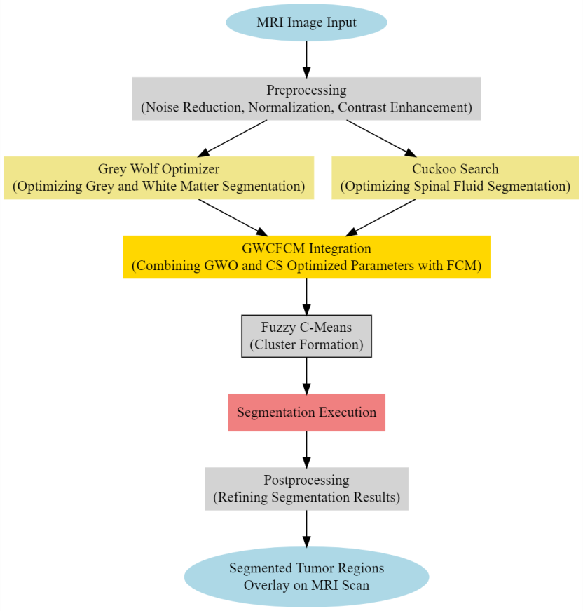 To overcome issues of low segmentation efficiency and higher complexity, the proposed model represents a state-of-the-art approach in medical imaging, leveraging the combined strengths of Grey Wolf Optimization (GWO), Cuckoo Search approach and Fuzzy C-Means (FCM) algorithms. As per figure 1, its architecture is meticulously designed, integrating GWO and CS to optimize the segmentation of brain tissues with exceptional precision.