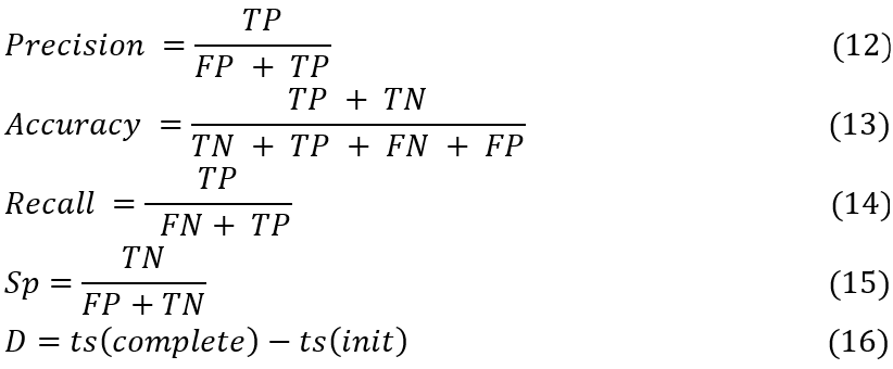 Based on this setup, formula 12, formula 13 and formula 14 were utilized for evaluating the precision (P), accuracy (A), and recall (R), levels based on the proposed technique, while formula 15 and formula 16 were utilized for evaluating Specificity (Sp), & delay as follows: