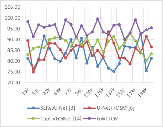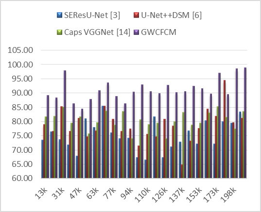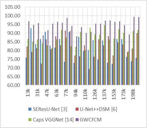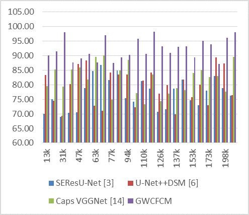 Likewise, the accuracy of the proposed model was compared in figure 3. In the simulated data, the GWCFCM model consistently shows a higher accuracy across different numbers of test image samples (NTS) compared to the other models.