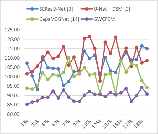 From the simulated data, the GWCFCM model consistently demonstrates higher specificity across different numbers of test image samples (NTS) compared to other models. For example, at 13k NTS, GWCFCM achieves a specificity of 89,25 %, which is considerably higher than SEResU-Net (73,57 %), U-Net++DSM (78,92 %), and Caps VGGNet (81,62 %). This trend of GWCFCM exhibiting higher specificity is observed throughout the dataset, reaching as high as 98,88 % at 216k NTS.