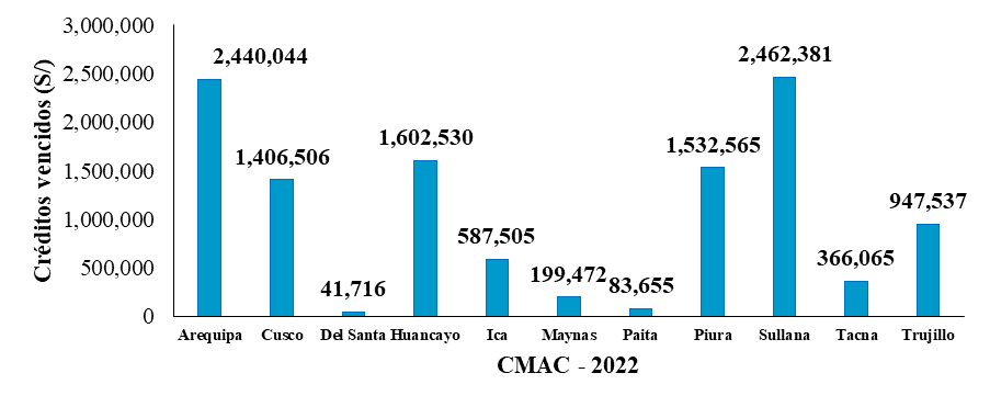En este sentido, la CMAC Sullana tuvo más cantidad en soles de créditos vencidos, sumando estos un total de S/ 2 462 381 en el 2022; mientras que, la CMAC con menos cantidad en soles de créditos vencidos fue Del Santa, con S/ 41 716, representando el 0,36 % del total de créditos vencidos de dicho año.