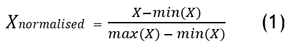 Normalizing numerical data: data normalization is putting numerical data in the 0 to 1 range to increase processing speed. We use the Min-Max method as shown in equation 1.