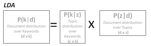 LDA, an unsupervised machine learning technique, finds extensive application in document modeling, classification, and information retrieval. The LDA perspective considers each document as a multinomial distribution across k topics, and each topic is represented as a multinomial distribution across words. Through the process of matrix factorization, LDA decomposes the co-occurrence matrix (documents, terms) into two lower-dimensional matrices: (documents, topics) and (topics, words), as shown in the figure 4.