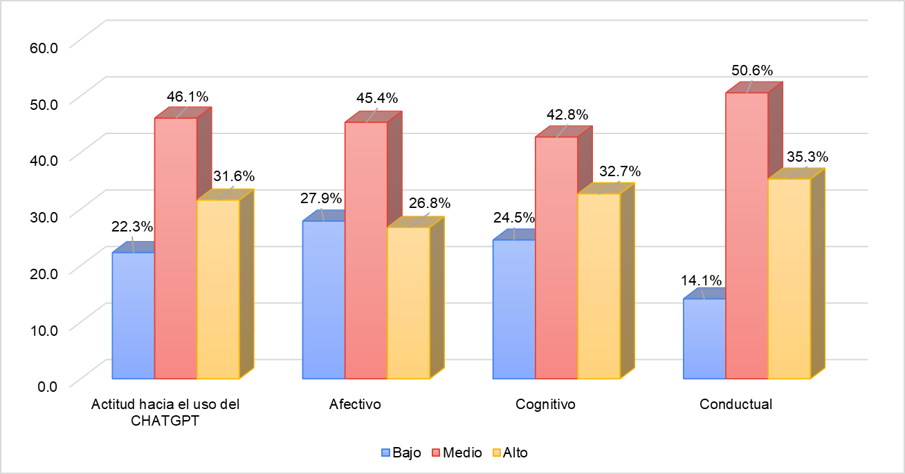 First, it was found that the attitude towards ChatGPT was predominantly rated at a medium level. In addition, the affective, cognitive and behavioral dimensions were also predominantly rated at a medium level. This indicates that students have a moderately positive attitude towards the use of ChatGPT, showing interest and willingness to use the tool. However, they may harbor some reservations or doubts, mainly due to the reliability of the content it generates. The willingness of students to use ChatGPT reflects an openness to the adoption of innovative technologies in their academic training, indicating an interest in exploring new ways of learning and taking advantage of the opportunities offered by AI in education.