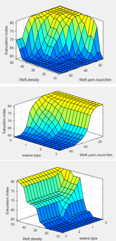 La saturación de los tejidos puede tener consecuencias perjudiciales, como problemas de rendimiento de los telares, desgaste acelerado de las piezas mecánicas y pérdida de materias primas. Para evitar estos problemas, a la hora de diseñar y crear nuevos tejidos, las densidades y las calidades de los hilos deben ajustarse cuidadosamente a los tejidos para garantizar el éxito de las pruebas. Para facilitar esta tarea, este estudio se centra en el desarrollo de un modelo práctico de lógica difusa para predecir la saturación de nuevos tejidos. Se llevó a cabo una parte experimental para validar este modelo difuso. Las muestras de tejido utilizadas en este estudio procedían de tres tipos diferentes de tejidos, a saber, liso, sarga y satén. Estas muestras también incluían cinco recuentos de trama (Nm) y ocho densidades diferentes. Los resultados obtenidos con el modelo de lógica difusa desarrollado se compararon con los valores experimentales. Los resultados de la predicción fueron satisfactorios y precisos, lo que demuestra la eficacia del modelo de lógica difusa desarrollado. El error absoluto medio del modelo difuso calculado fue del 1,97 %. Por lo tanto, se confirmó que este modelo difuso era rápido y fiable para predecir la saturación del tejido nuevo.