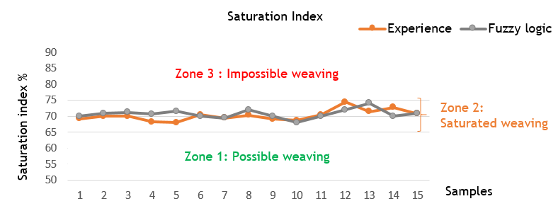 The aim of our research is to develop a fuzzy logic-based model for predicting the saturation of a new fabric and to compare the results of this model with experimental results on looms. Weaveability refers to the ability of a material to be woven successfully in a textile manufacturing process (weaving).