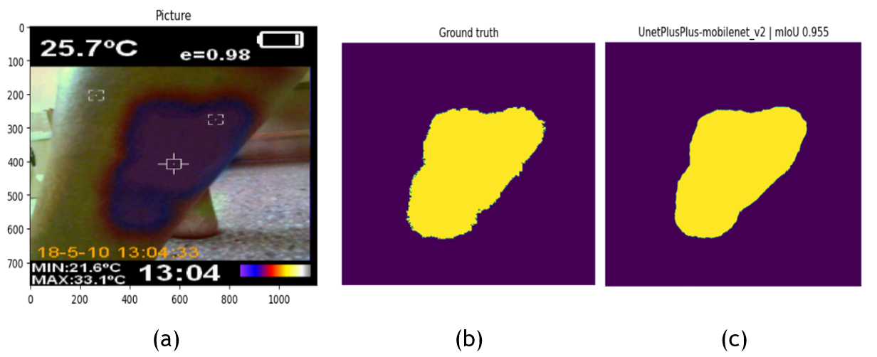 Método: para proporcionar un diagnóstico preciso y no invasivo, el trabajo actual enfatiza en la Vasculopatía Diabética (VD) que se analiza con imágenes de termorregulación a través de Segmentación Semántica (SS). Se adaptó una metodología novedosa que combina imágenes de termorregulación con SS utilizando el modelo U-Net++ para investigar las distribuciones de temperatura a nivel de la piel. Este trabajo presenta un método novedoso que utiliza MobileNetV2 como codificador para una rápida extracción de características (FE).