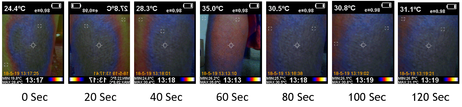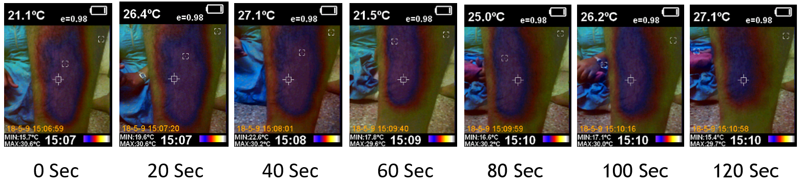 The patients’ images under cold stress are displayed in figure 8. The pictures (a) and (b) depict the photos of patients 1 and 2, diabetic less than 10 years old, and were taken at intervals of 0, 20, 40, 60, 80, 100, and 120 seconds, respectively. Pictures (c) and (d) depict the neuropathic patient photos of 1 and 2, obtained at intervals of 0 seconds, 20 seconds, 40 seconds, 60 seconds, 80 seconds, 100 seconds, and 120 seconds, respectively.