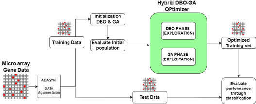 By combining the Dung Beetle Optimization (DBO) algorithm’s exploratory capabilities with the Genetic Algorithm’s (GA) exploitative strengths, this hybrid approach HGDBO aims to overcome these limitations. This novel method enhances accuracy and efficiency in identifying relevant genes for disease classification, offering significant improvements over existing methodologies in terms of stability, computational efficiency, and overall classification performance.