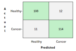 A confusion matrix is a table that assesses the performance of a classification model by showing the actual versus predicted classifications, including true positives, false positives, true negatives, and false negatives. Figure 2 presents the confusion matrix for the proposed Naïve Bayes classifier used to differentiate between healthy genes and ovarian cancer genes. It indicates 108 true negatives, 12 false positives, 11 false negatives, and 114 true positives, thus illustrating the model’s accuracy in classifying actual healthy and cancer cases.
