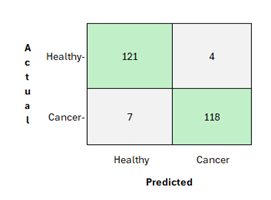 Figure 3 indicates the confusion matrix performance of a random forest classifier with 121 true_negatives, 4 false positives, 7 false_negatives, and 118 true_positives. It indicates how well the model distinguishes between healthy and cancer cases based on actual outcomes.