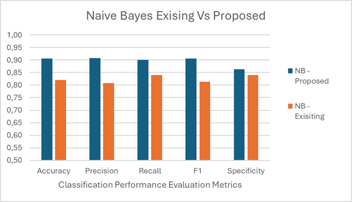 The table 3 compares two Naive Bayes classifiers, one proposed and one existing. The proposed model shows higher performance with 0,91 accuracy, precision, and F1 score, and 0,90 recall. The existing model has lower scores, with 0,82 accuracy, 0,81 precision, 0,84 recall, and 0,81 F1 score. Specificity is slightly lower for the proposed model (0,86) compared to the existing model (0,84). Figure 4 compares existing and proposed naïve bayes classifier model. The proposed model approximately performs 10 % over the existing classifier model