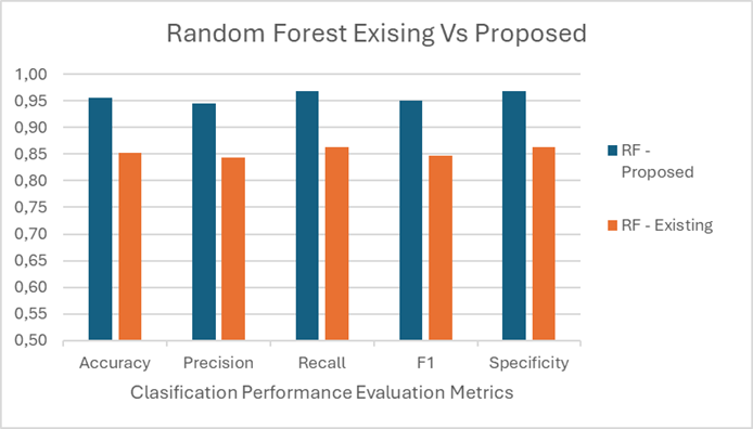 The table 4 compares the performance of two Random Forest (RF) models, one proposed and one existing. The proposed RF model demonstrates superior performance, achieving 0,96 accuracy, 0,95 precision, 0,97 recall, a 0,95 F1 score, and 0,97 specificity. In contrast, the existing RF model shows lower metrics with 0,85 accuracy, 0,84 precision, 0,86 recall, a 0,85 F1 score, and 0,86 specificity, indicating the proposed model’s significantly better classification capabilities.