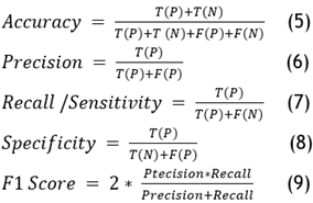 Performance analysis involves evaluating metrics such as accuracy, F1-score, precision, recall, true negative rate (TNR), and true positive rate (TPR). Comparing these metrics with those of other techniques provides deeper insights into the models’ efficiency and effectiveness. The confusion matrix includes values for true positives (TP), true negatives (TN), false positives (FP), and false negatives (FN). TP indicates cases where the actual value is 1 and the predicted value is also 1. TN represents instances where both the actual and predicted values are 0. FP denotes situations where the actual value is 0 but the predicted value is 1. FN indicates cases where the actual value is 1 but the predicted value is 0.(23)