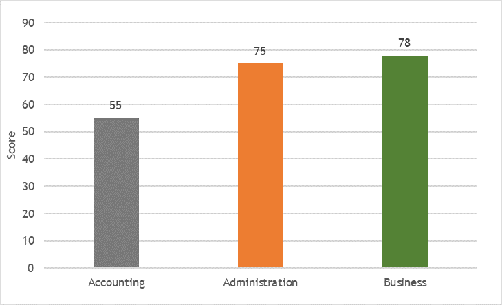 Regarding Security Settings, administration students demonstrate a high level of knowledge with an average score of 76. Business students scored 65, and accounting students scored the lowest at 56. These results show that administration students are more proficient in configuring and managing security settings across different devices and platforms. The significant gap between the grades of administration and accounting students suggests that the latter group may need further education to improve the understanding and implementation of security arrangements, which are critical to protecting organizational and personal data. Comparison of results Graphically can be seen in the following figure 4.