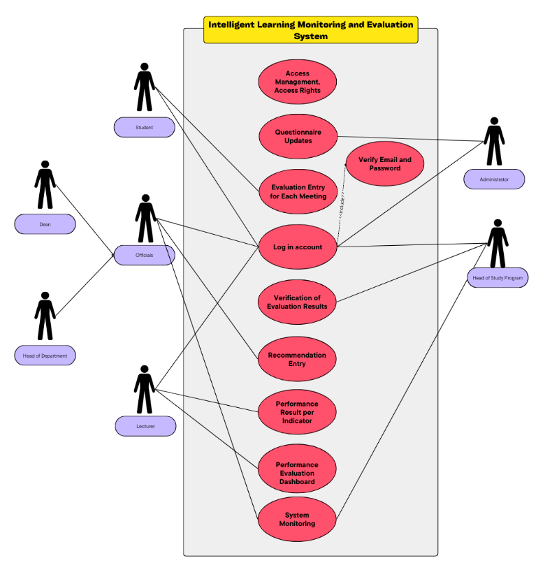The Use Case Diagram in figure 4 in the context of the Intelligent Learning Monitoring and Evaluation System with the CodeIgniter framework and PostgreSQL database at the Faculty of Engineering UNP will describe the interaction between users (actors) and the system in terms of the functionality provided by the system.