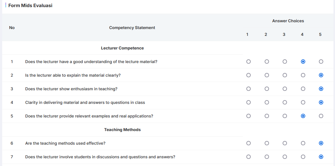 Monitoring and evaluation (Monev) is an important part of the learning process in higher education(9). Monev Learning in the duties of the Quality Assurance Unit on a campus requires monev activities to evaluate all learning activities from the beginning of the semester until the end of the semester ends, one of which is determining the evaluation of lecturer performance according to their field of expertise. Learning evaluation is the main key to ensuring the effectiveness of the education system in providing quality learning experiences to students.(10) Quality assurance in higher education emerged when higher education institutions faced difficulties in monitoring the quality level of their services.(11)