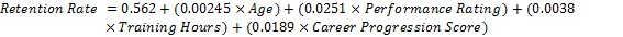 The correlation analysis brought into light the existence of significant relationships among metadata features underlining their interconnectedness with talent management. For example, the moderate correlations of Retention Rate with Training Hours and Career Progression Score suggest the interaction of development opportunities and pathways to advancement. These results show that holistic approaches toward several facets of employee experience will yield maximum benefits in retention.