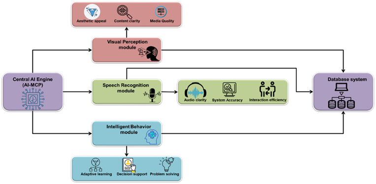 To improve system performance, use the AMSA optimization technique in conjunction with the AI-MCP framework. It increases the precision, effectiveness, and flexibility of tasks, including speech recognition, visual perception, and intelligent behaviour. In general, an AI-assisted multimedia creation platform for college instruction looks similar to this. Figure 1 displays the system's three main modules are organized as follows: intelligent behaviour, speech recognition, and visual perception. The platform's visual components are guaranteed to be engaging and instructive due to the visual perception module's assessment of media quality, content clarity, and aesthetic appeal. It emphasizes the accuracy of the system, the aural clarity of the speech, and the effectiveness of the engagement; the voice interface facilitates fluid exchanges between the teacher and the system. For the system to modify content and provide insights based on student performance, the intelligent behaviour module addresses adaptive learning, decision-making assistance, and problem-solving skills. The system will communicate with the database that contains user data, performance results, and learning outcomes. Since all modules communicate with the core AI engine (AI-MCP) that is the processing unit, it incorporates an effective learning environment for both teachers and students.