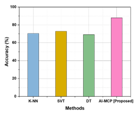Accuracy values demonstrate in table 3 and figure 5 how well various approaches classify the data. K-Nearest Neighbors (K-NN) scores 70,5 %, Support Vector Machine (SVM) outperforms it at 73 %, and Decision Tree (DT) comes in at 69,2 %. By attaining 88 %, the suggested AI-MCP approach considerably enhances performance. This leads to the demonstration of the AI-MCP's excellent prediction capacity in comparison to the conventional ways of performance, which is obviously advantageous in terms of increased classification precision and accurately reflects the real-world application with excellent results.