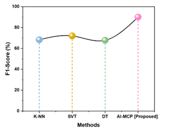F1 Score values are shown in table 3 and figure 6 how each categorization system balances recall and precision. K-Nearest Neighbors (K-NN) performs an F1 Score of 68,3 %. With 72 % performance, Support Vector Machine (SVM) at 67,8 %, Decision Tree (DT) received a marginally lower score. With an F1 Score of 90 % and exceptional precision and recall, the suggested AI-MCP approach proved to be highly successful for precise categorization.