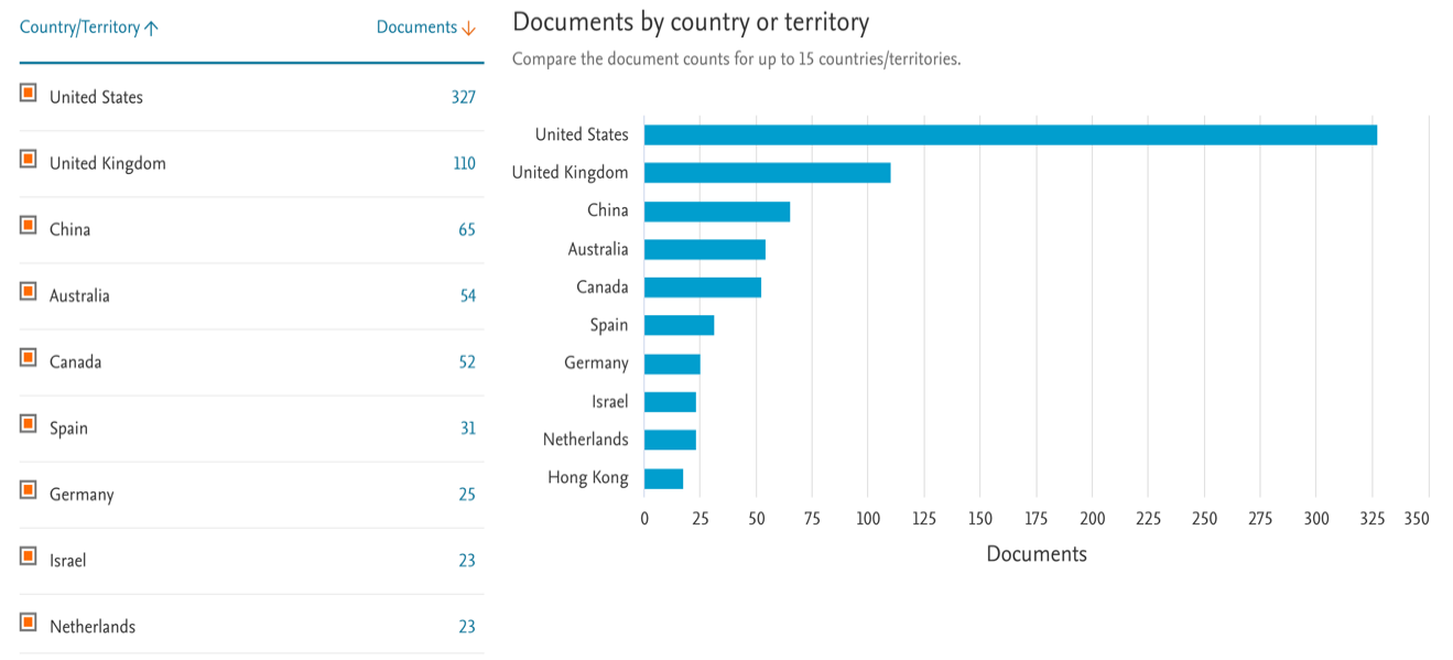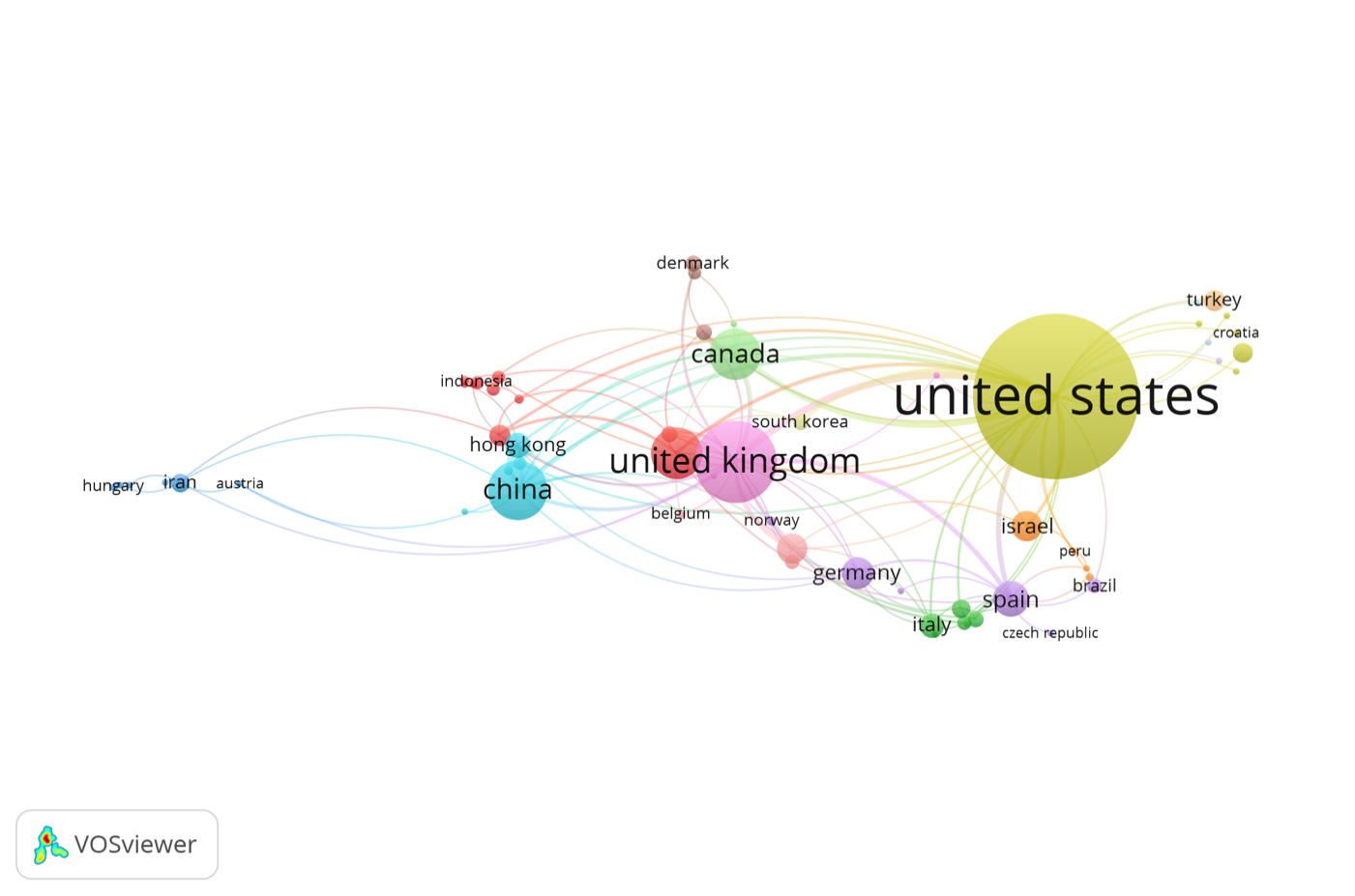 Figure 3 illustrates the top ten countries contributing to global scientific research publications on the theme of teacher mindfulness from 2014 to 2024. Figure 3 indicates that the United States is the leading contributor to Scopus-indexed scientific research publications on the topic of teacher mindfulness from 2014 to 2025, with a total of 327 Scopus-indexed documents. The United Kingdom ranks second, contributing 110 scientific article documents. China ranks third, contributing 65 scientific journal articles. These three countries are the primary contributors to Scopus-indexed scientific journal articles on teacher mindfulness, although there is a significant disparity in the number of publications among them. Australia and Canada contributed a total of 54 and 52 scientific publications, respectively, on the topic of teacher mindfulness. Spain, Germany, Israel, and the Netherlands contributed 31, 25, 23, and 23 scientific publications, respectively. Hong Kong ranks last among the top 10 countries or territories, contributing 17 scientific publications on teacher mindfulness from 2014 to 2024. The subsequent step involves visualizing the co-authorship data pertaining to the subject of teacher mindfulness. The initial visualization pertains to co-authorship in relation to the country of origin. This study analyses cross-country author collaboration, author networks, and influences in the field of teacher mindfulness.