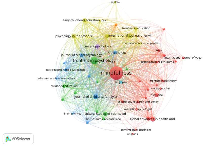 The co-citation relationship among these journals is observable in co-citation analysis. Co-citation analysis reveals the connections between documents that are cited together in the references of scientific works. Figure 7 illustrates that the Mindfulness journal exhibits a robust co-citation and bibliographic coupling relationship with documents from both the same and different clusters.