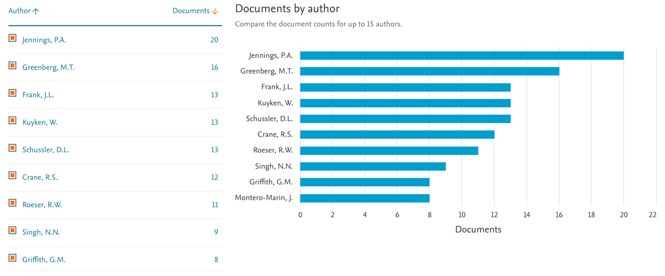 Figure 8 indicates that Jennings, P.A. is the leading contributor to scientific research on teacher mindfulness from 2014 to 2024, as evidenced by a total of 20 documents indexed by Scopus. Greenberg, M.T. contributed 16 documents, while Frank, J.L., Kuyken, W., and Schussler, D.L. each contributed 13 documents. Crane, R.S. possesses 12 documents, while Roeser, R.W. has 11 documents. Additionally, Singh, N.N. provided a contribution of nine documents. Griffith, G.M. and Montero-Marin, J. each authored 8 scientific documents focussing on the theme of teacher mindfulness.