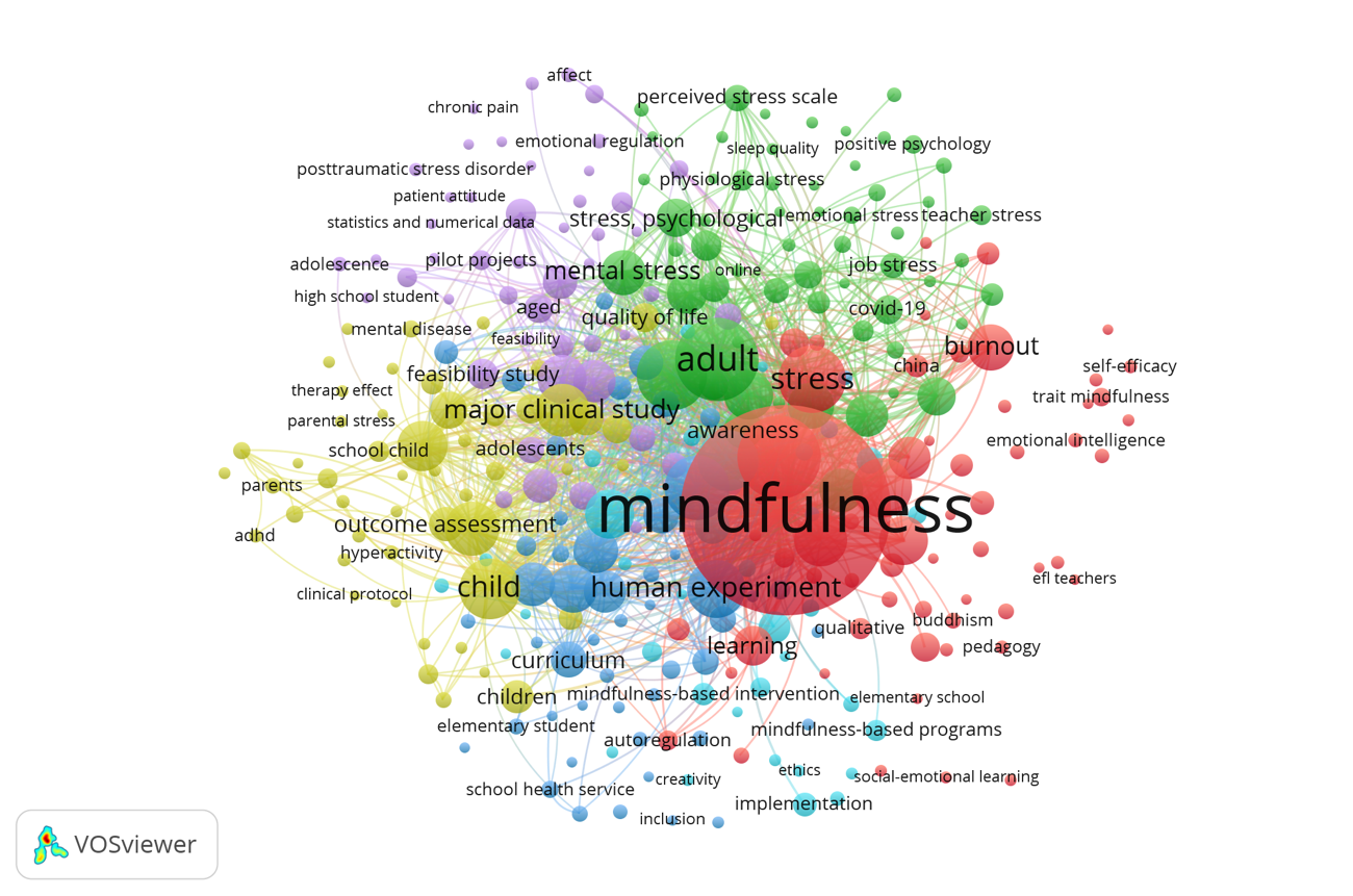 Results: there has been significant growth in the quantity of articles on teacher mindfulness subjects during the last decade. A total of 783 papers were analyzed, published across 159 journals, with Mindfulness being the most popular journal. Collaboration among authors occurred across 74 different countries, resulting in 16 clusters, with the United States and the United Kingdom as the leading contributors to the publication of scholarly works on the subject of mindfulness. Jennings, P.A. is the author who most contributed to the publication. Furthermore, topics about teacher mindfulness, trait mindfulness, mindfulness in teaching, psychological stress, teacher well-being, job satisfaction, and teacher professionalism, which have great opportunities for further research, relate to the theme of teacher mindfulness.