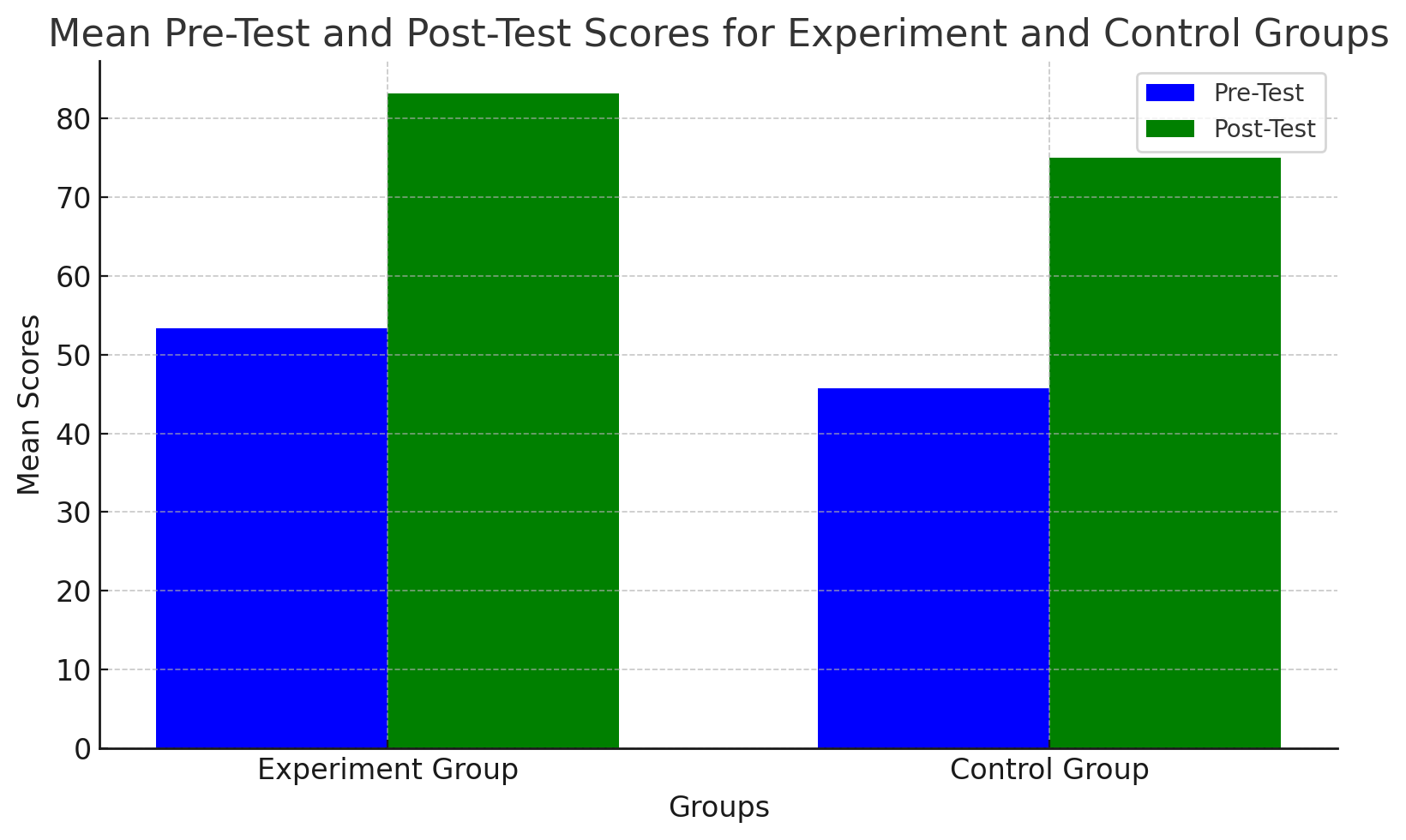 This study evaluates the effectiveness of the STEM Learning Project model in AI courses by analyzing both qualitative and quantitative data. The quantitative findings, obtained through pre- and post-assessment surveys, highlight significant improvements in students’ knowledge, engagement, and interdisciplinary understanding of AI concepts. These results are reinforced by a comparative analysis between the experimental and control groups, with the STEM Learning Project group exhibiting more substantial progress than the group following the traditional AI curriculum. A descriptive analysis was conducted on the pre-test and post-test scores of both groups, and the results of this analysis are summarized in the accompanying table.