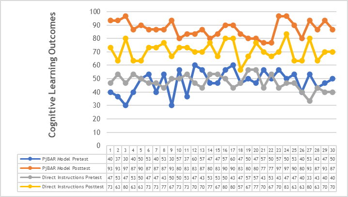 The distribution of pretest and posttest scores in the PjBAR class and direct instruction class is presented in figure 1. The figure illustrates a significant increase in the PjBAR class posttest scores, with a more even distribution of scores in the high range (above 80). In contrast, the direct instruction class showed a more limited increase, with some students still in the low range.