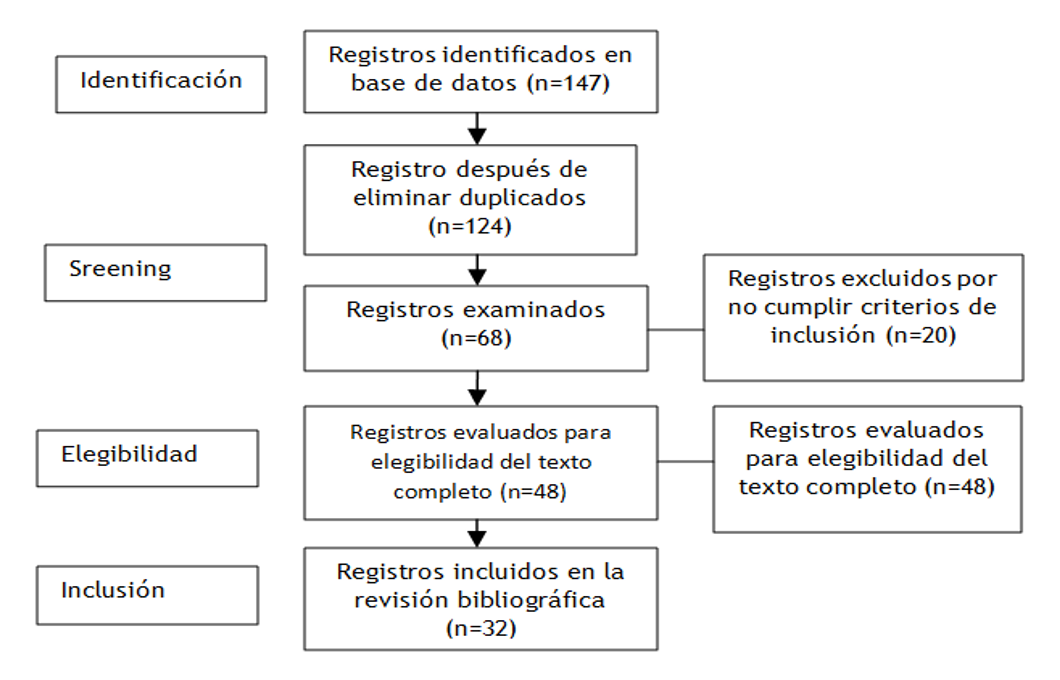 Para el análisis de los resultados se utilizó el método Preferred Reporting Items for Systematic (PRISMA) y se siguió el diagrama de flujo el cual consta de cuatro fases los cuales son identificación de los resultados en bases de datos, el screening y elegibilidad según los criterios fijados, así como los artículos incluidos en esta revisión bibliográfica.