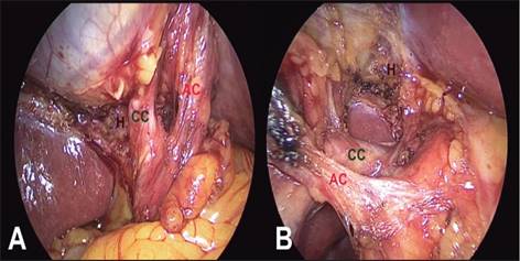 La visión crítica de seguridad se debe comprobar desde la visión directa en planos contrarios en A: derecha a izquierda y en B: izquierda a derecha. Las letras señalan H: Lecho hepático, AC: Arteria cística y CC: Conducto cístico.(15)
