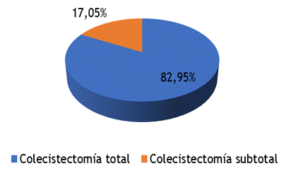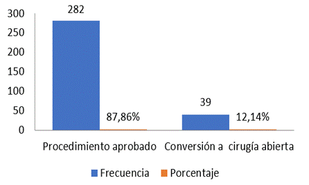 Para realizar una valoración de los resultados obtenidos con la aplicación de esta técnica operatoria, se pudo analizar varias investigaciones realizadas por diferentes autores, dentro de las cuales se toman dos como ejemplos. En la investigación realizada en 2021 por Morales J. et al(4), se realizó un estudio que incluyó a 321 pacientes con colecistitis aguda. La edad promedio fue de 49 años (DE: ± 16,8). El mayor número de pacientes analizados fue 65 % del sexo femenino y el 35 % del sexo masculino (figura 4).